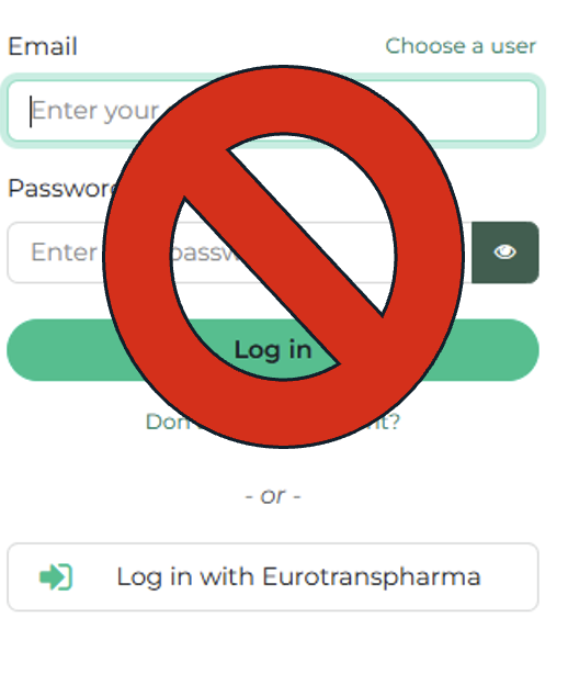 - Click on button with arrow 'Log in with Eurotranspharma' - Please DO NOT enter your email address as this only applicable for the supplier.